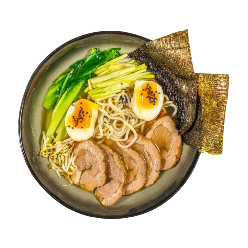 mięso, makaron, pak choi, kiełki, jajko, szczypiorek, bambus