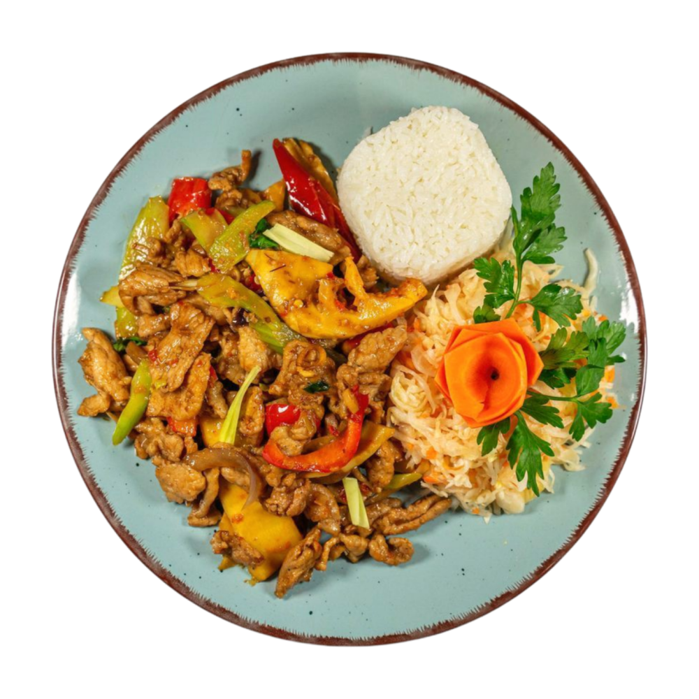 wieprzowina, cebula, szczypiorek, grzyby mun